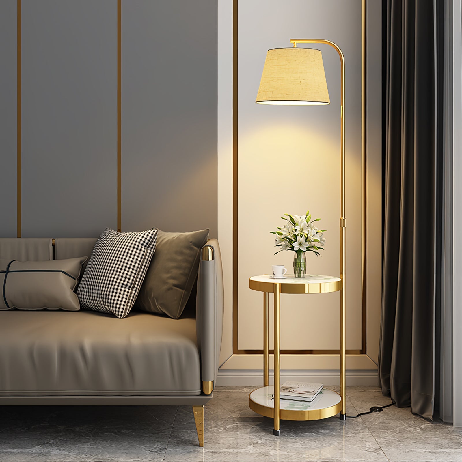 Gold Floor Lamp Table with Storage Shelf illuminates your space while adding a functional surface in one stylish piece. This design pairs a luxe gold metal base with a warm beige drum shade and a faux marble tabletop to create a modern, timeless accent for your bedroom or living area. A convenient storage shelf sits beneath the tabletop, providing easy access to remotes, phones, books, and other small essentials.